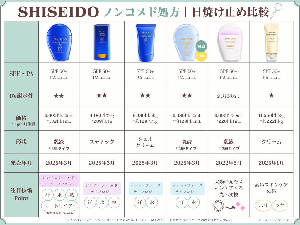 【スペック表】ノンコメド処方の日焼け止め6選|SHISEIDO