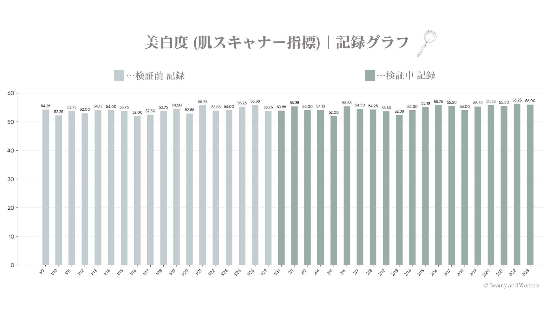 ※「美白度」:筆者が使用する家庭用の測定機器(BELLATECH 肌スキャナー)では、毎日の測定で表示される項目の1つに「美白度」があります。これは "肌の明るさ(数値が高いほど 肌が明るいという意味)"などを示す機器独自の指標(目安)であり、医薬部外品で言われる「美白(メラニンの生成を抑え、しみ・そばかすを防ぐ)」の効能を保証しているものではありません。