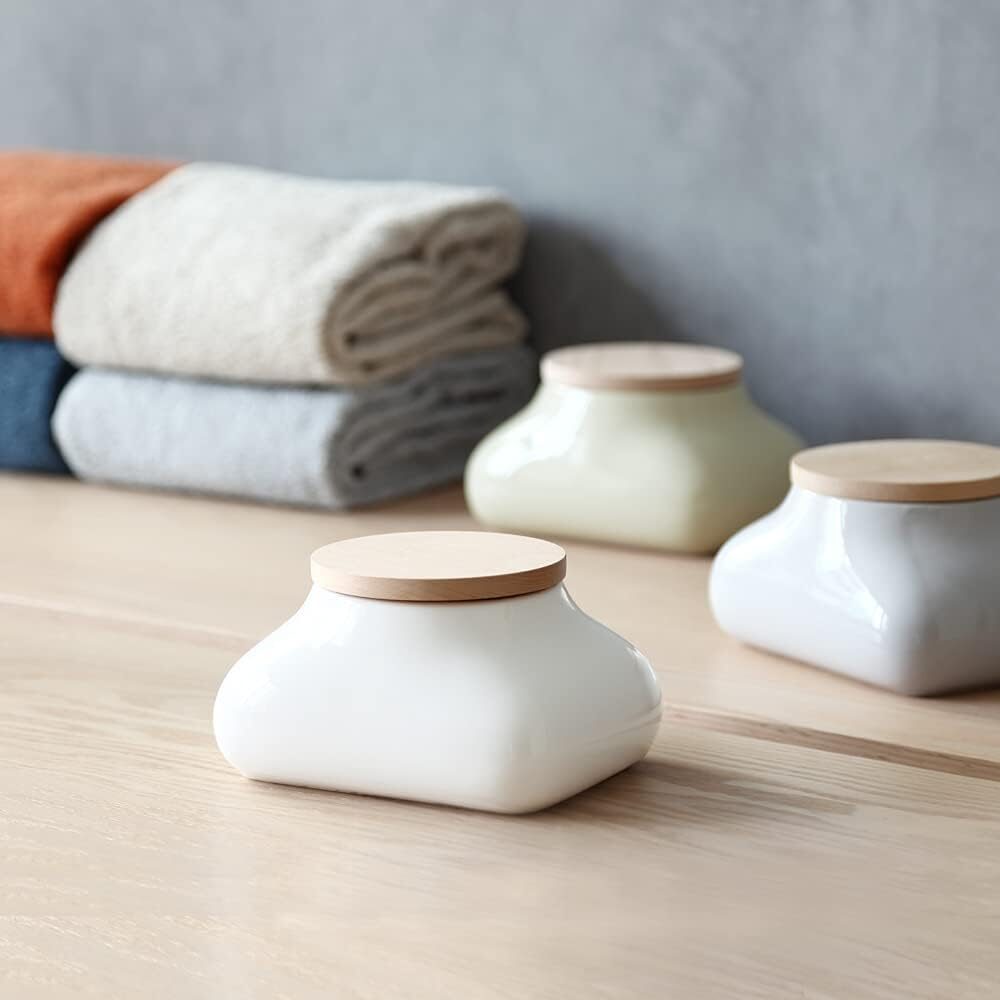 一見ウェットティッシュが入っているとは思えない、洗練されたデザイン。「ウッド調のフタ× 陶器の本体」の組み合わせや、フォルムが絶妙に可愛い。