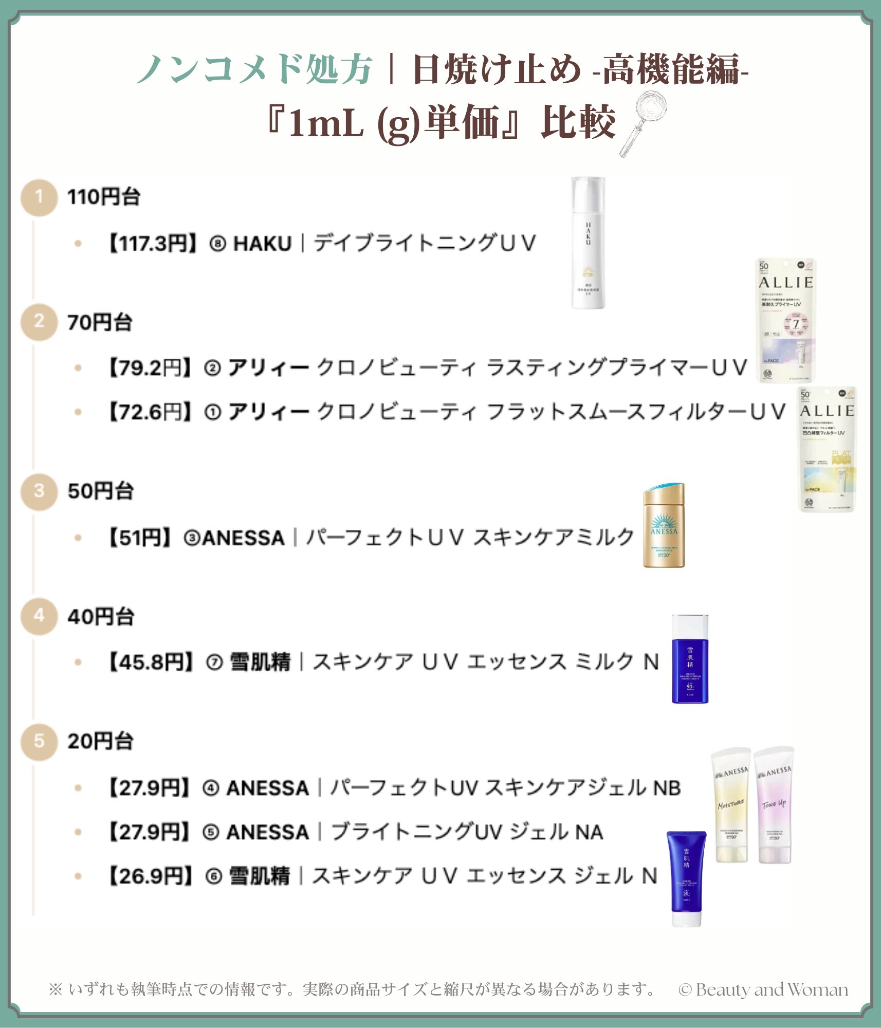 当記事でのラインアップアイテムを、1mL単価 *で並べました。(執筆時点での価格) *1mL(g)単価= 税込価格 ÷ 内容量 (小数点第二位以下は四捨五入)