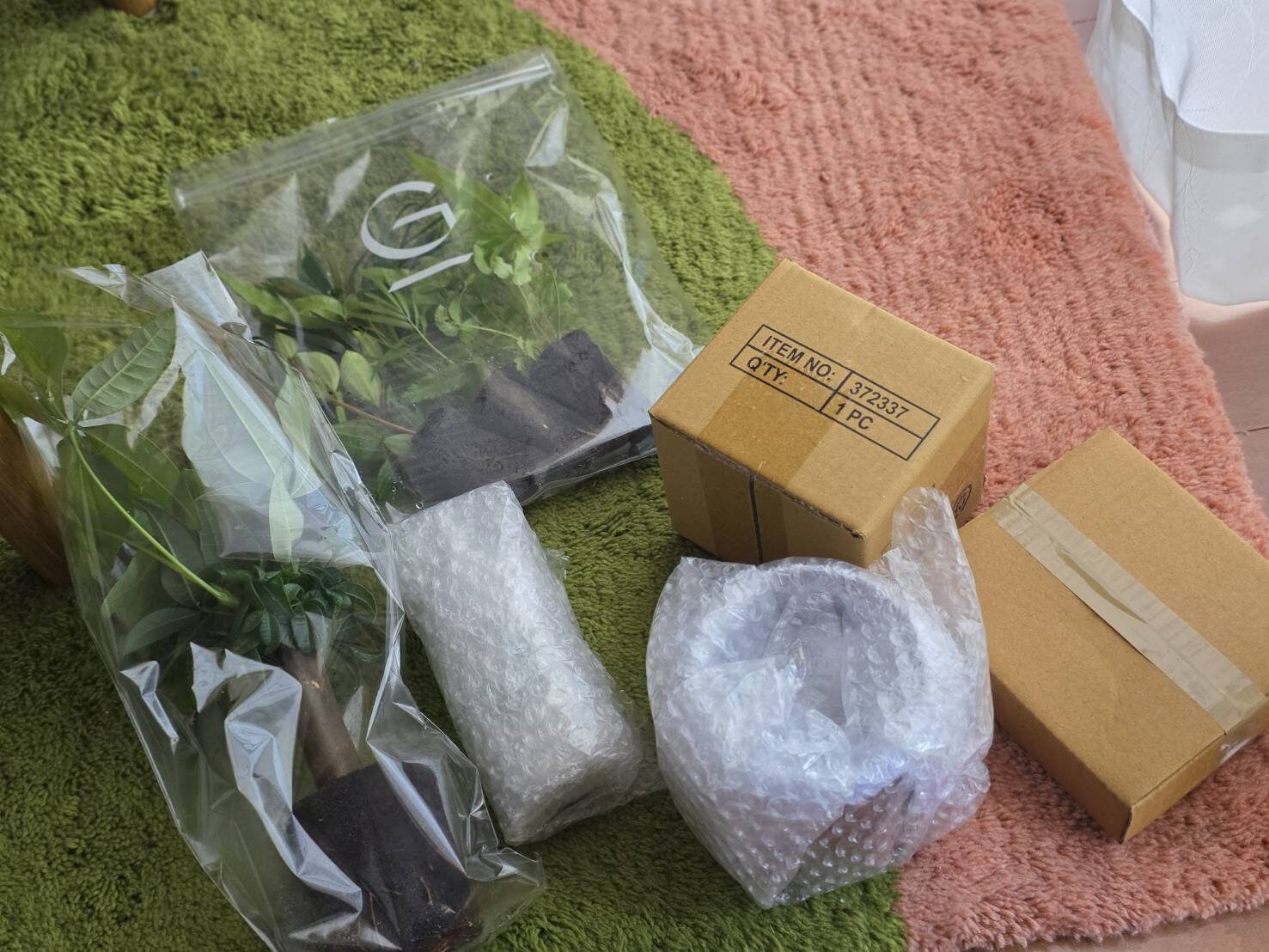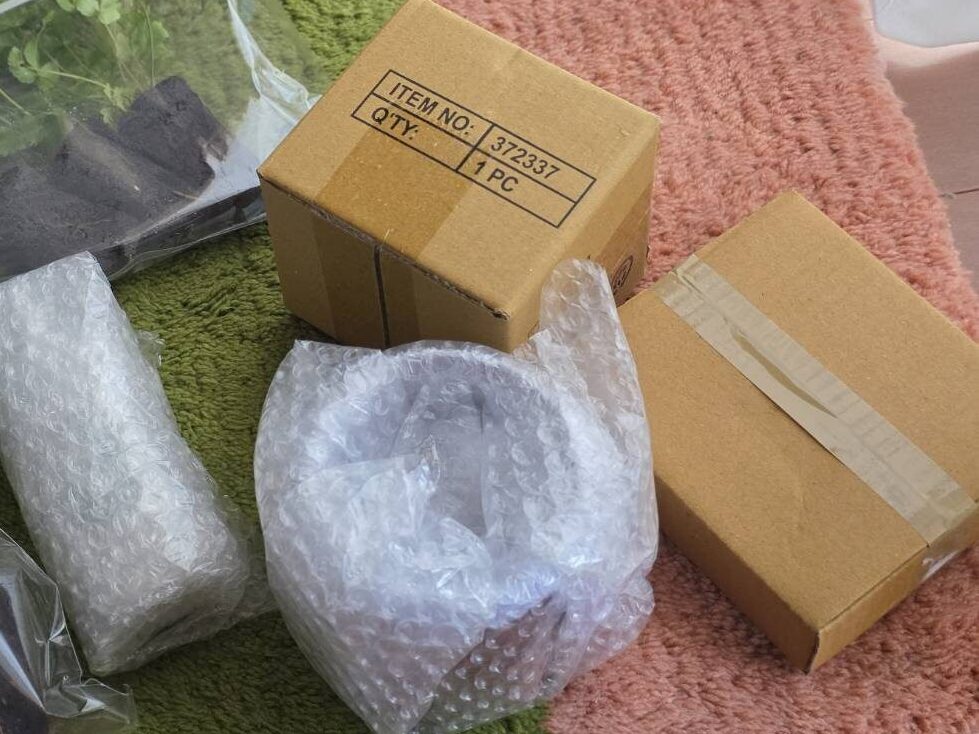 今回、植物とセットで「ガラスの鉢」や「鉢置き(スタンド)」なども色々家族が贈ってくれたので、段ボールで届きました◯