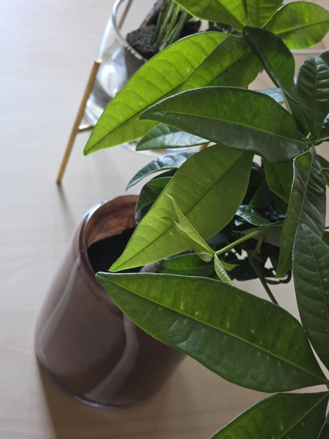こちらはCustom Setより背丈が高めな「パキラM」です。背丈は大きめなものの、こちらも直径的には「3号鉢サイズ(直径おおよそ9~10cm程度)*に入りました。(筆者の器例:直径9.8㎝×高さ9.8㎝)