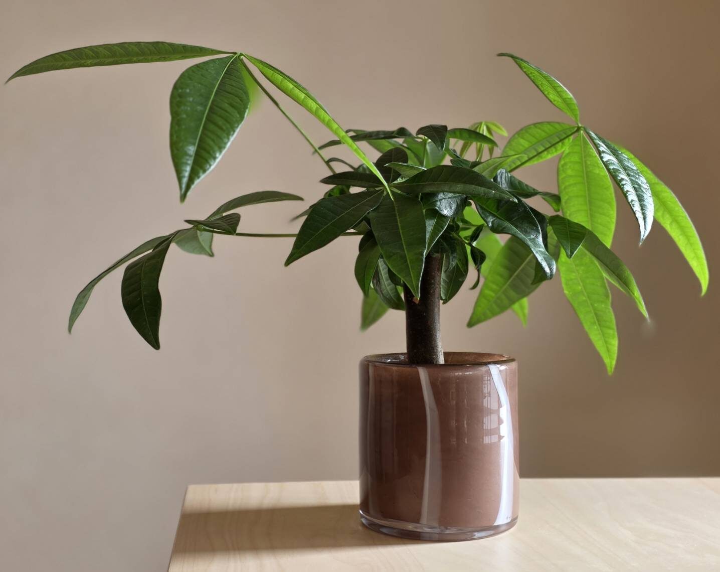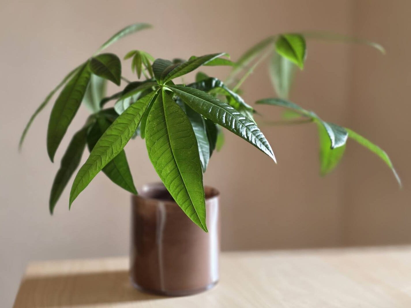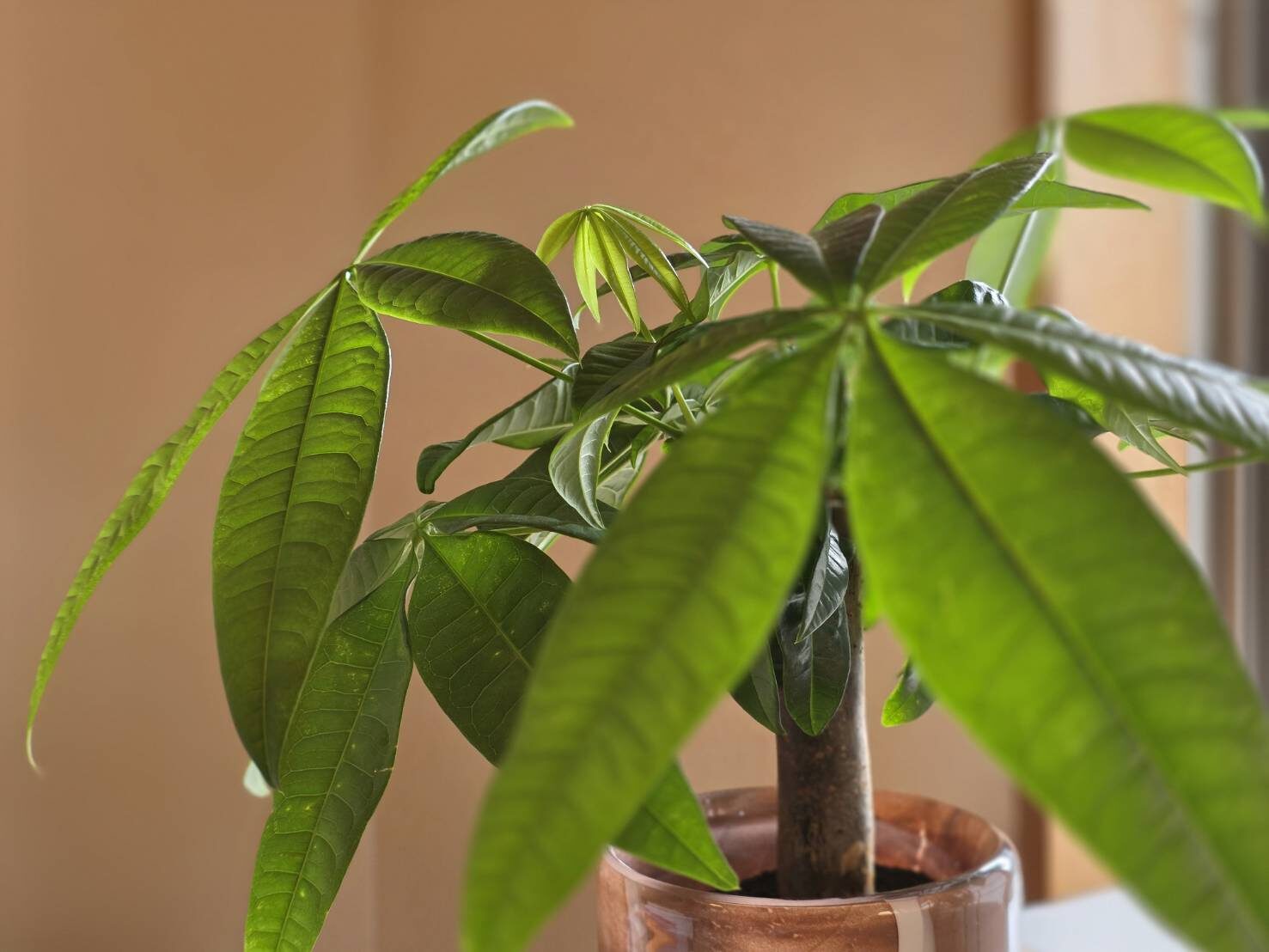 今のところはデスク上に置いてあるのですが、結構 横にも枝が伸び広がっていくパキラさんなので、デスクに収まりきらなくなったら置き場所を変えようと思っています◯